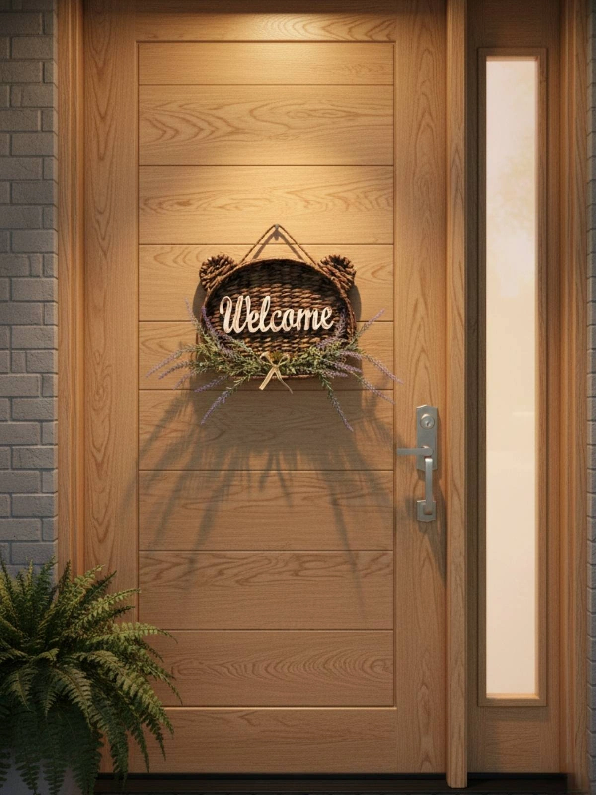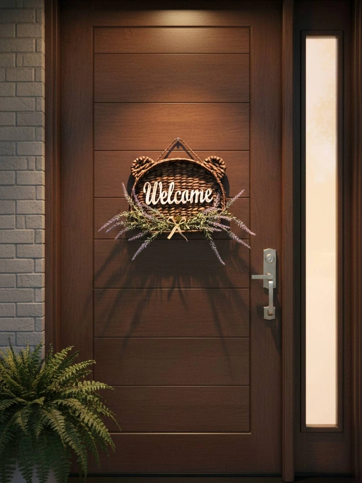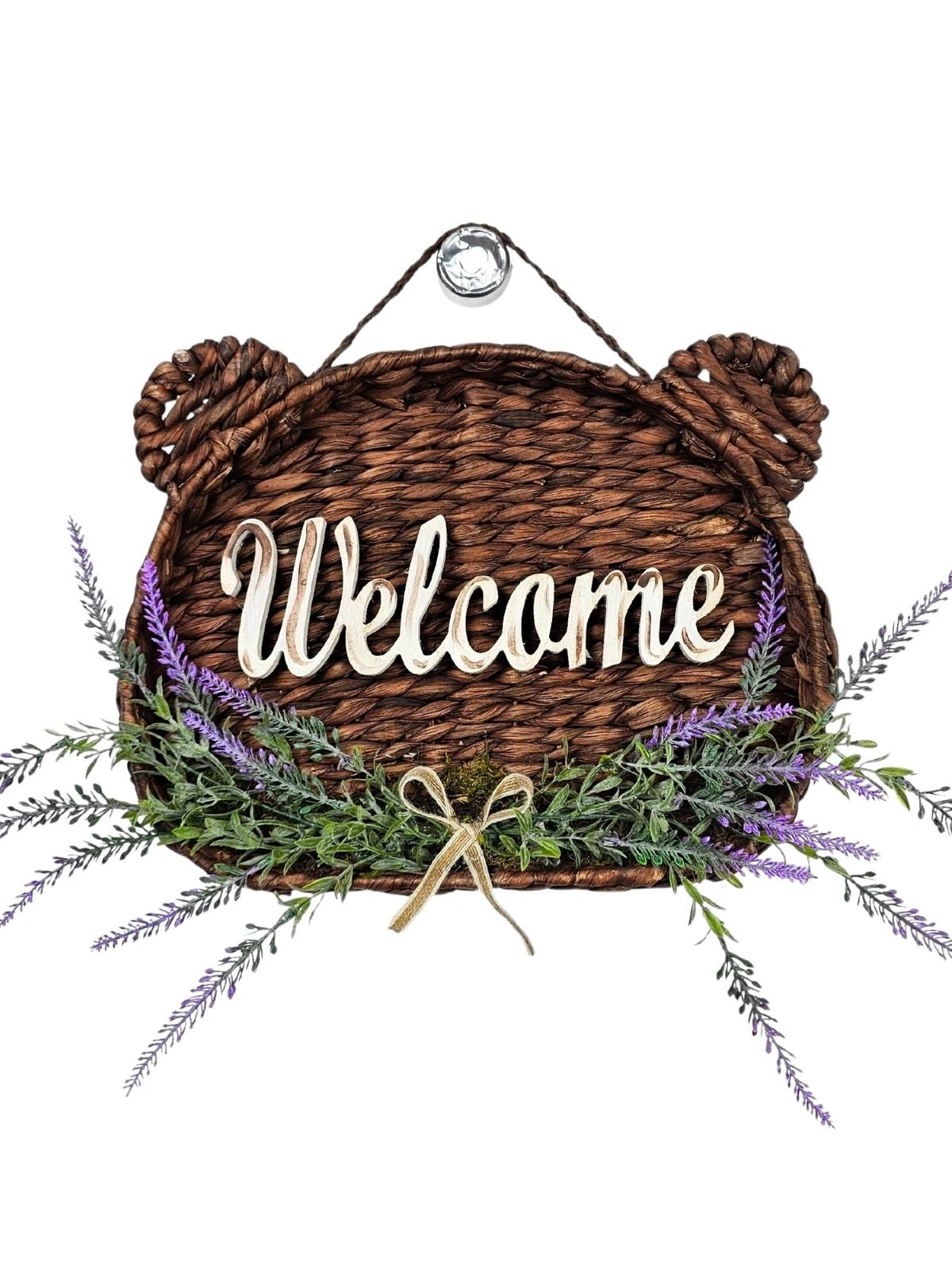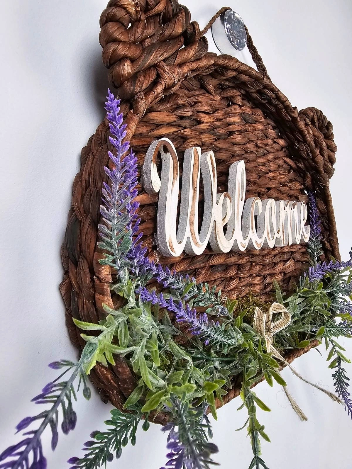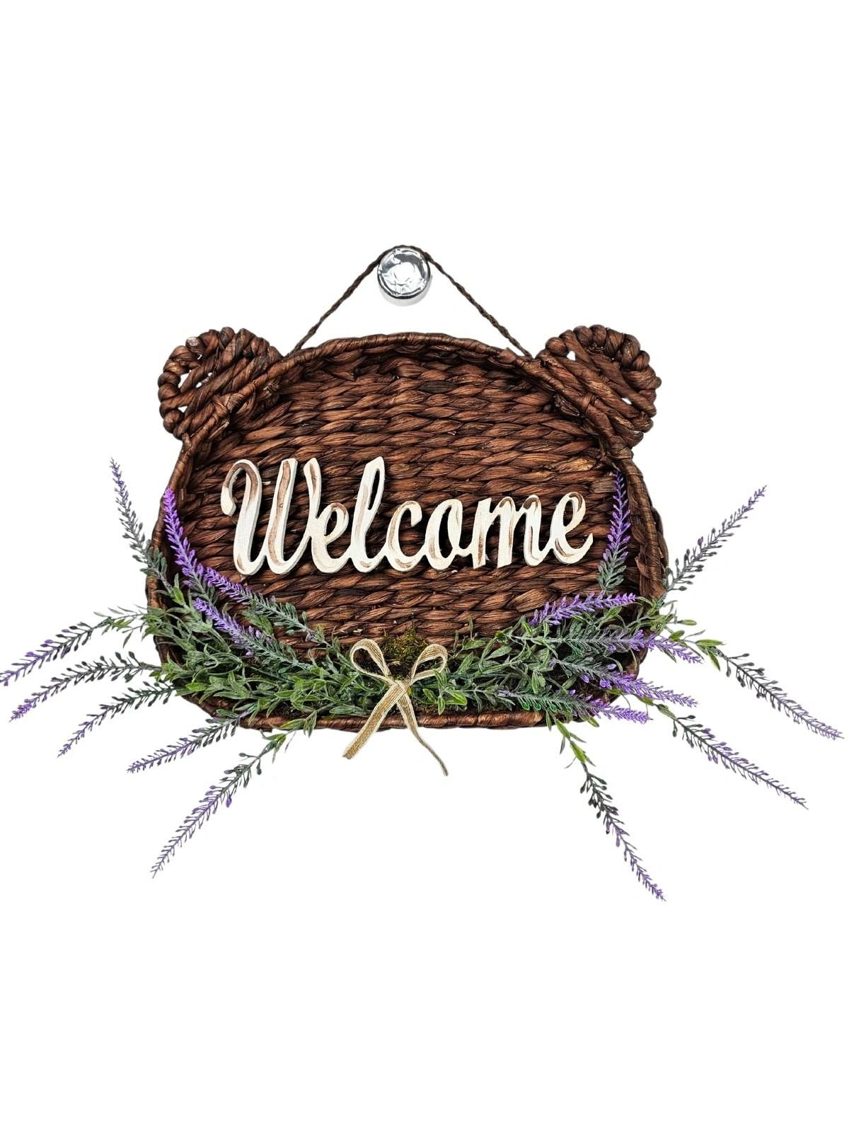 Tamamen el emeği ile üretilmiştir. Doğal hasır dokusu rustik bir görünüm kazandırırken, alt bölümde kullanılan gerçekçi yapay lavanta ve yeşillikler tasarıma zarif bir doğallık katar. Üzerindeki “Welcome” yazı detayı ise sıcak bir karşılama hissi oluşturur.
