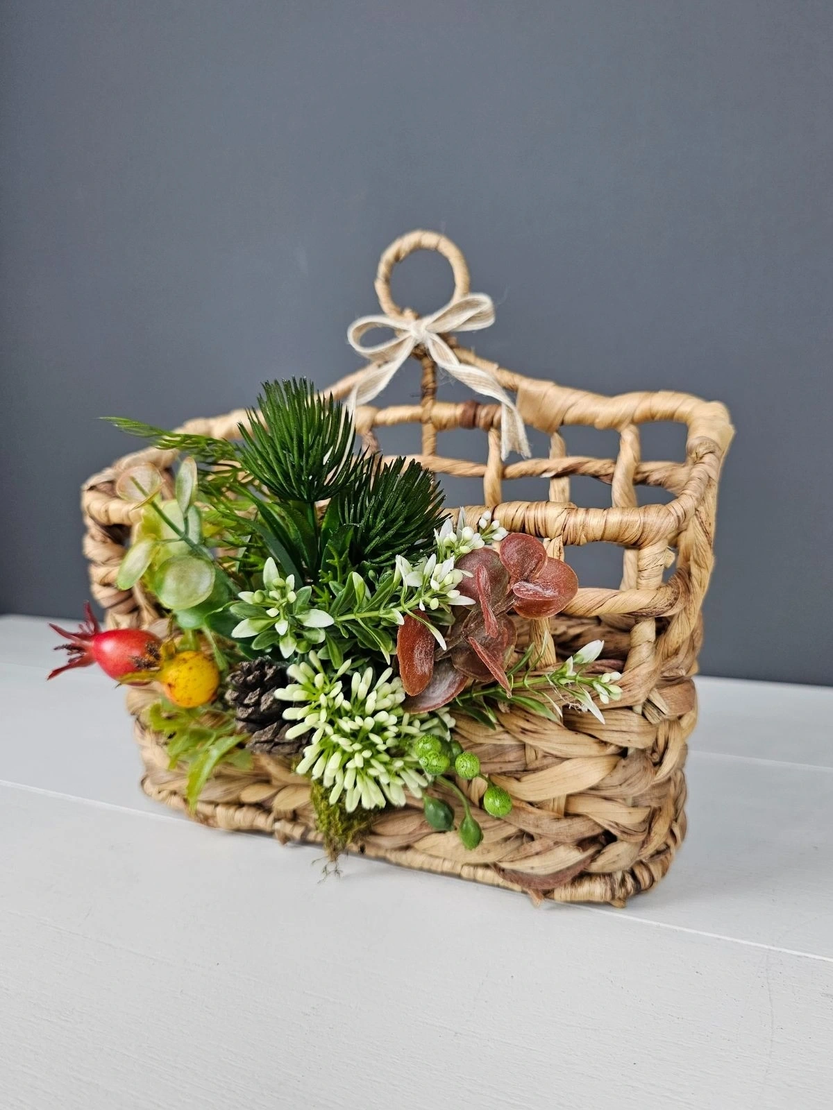 Dekoratif Yapay Çiçekler: Bakım gerektirmeyen, yıl boyunca canlı kalacak zengin yapay bitki ve meyve detayları ile süslenmiştir.