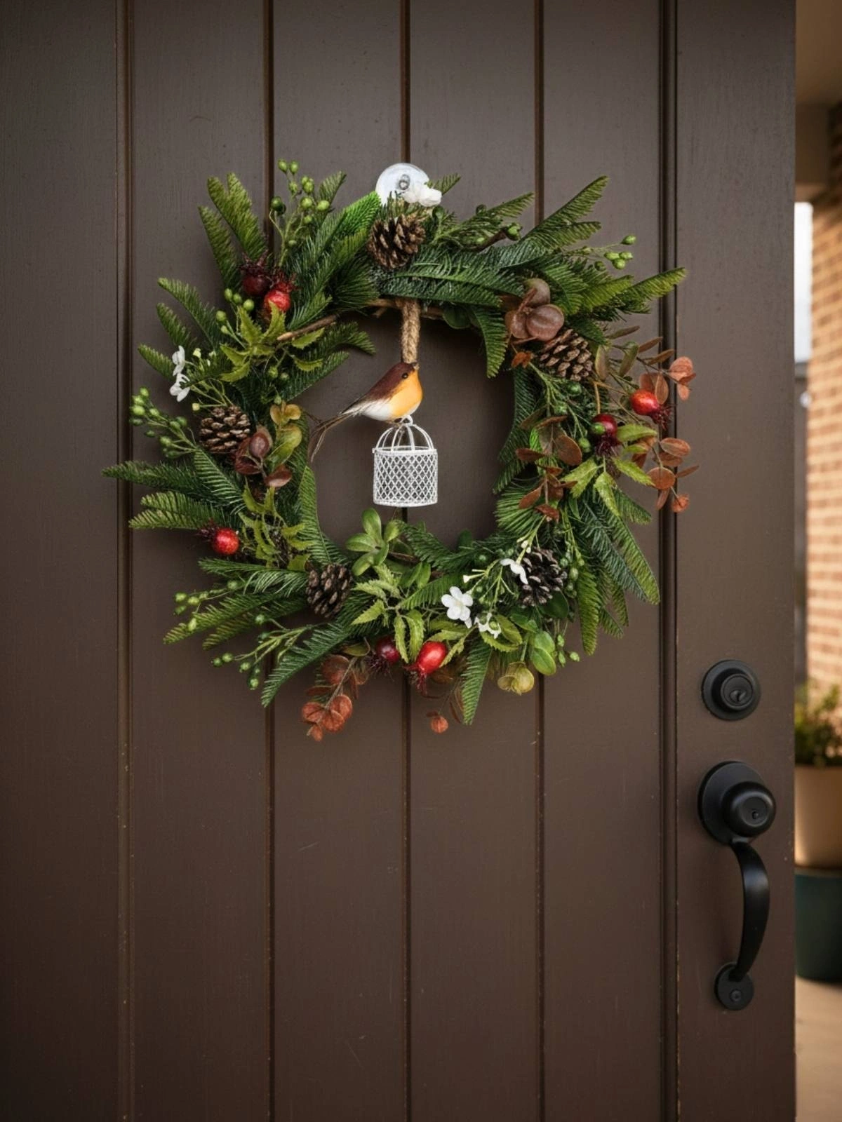 Bu dekoratif kapı süsü, arka kısmında kullanılan gerçek doğal ağaç çember sayesinde dayanıklı ve uzun ömürlüdür. Üzerindeki gerçekçi yapay çiçekler, yapraklar, kozalaklar ve meyve detayları sayesinde doğal kapı süsü görünümü sunar.